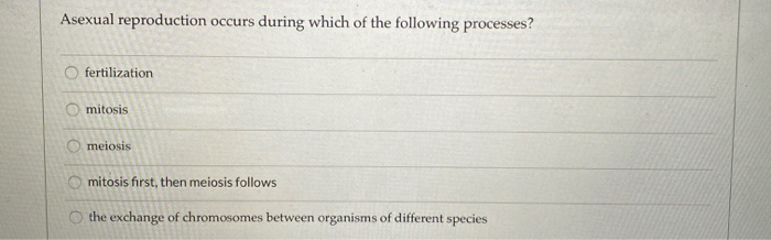 Solved Asexual Reproduction Occurs During Which Of The Following Processes Fertilization Mitosis Mentls Mitosis First Then Meiosis Follows The Exchange Of Chromosomes Between Organisms Of Different Species